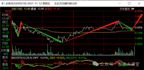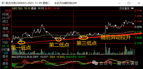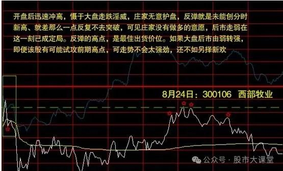 表明该股慑于大盘走跌淫威,庄家无意护盘,不能寄予后市走强的厚望。在下穿开盘价或股价反弹时出局,是短线操作的必要举措。反弹就是未能创分时新高、往往就差那么一点不去突破,可见庄家没有做多的意愿,后市走弱在这一刻已成定局。反弹的高点,是最佳出货价位。如果大盘后市由弱转强,即便该股有可能试攻前期高点,可走势不会太强劲,还不如另择新股。