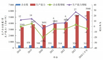 然而,据《中国人造板》不完全统计,2024 年上半年全国建成投产24条刨花板生产线,新增生产能力760万m³/年,全国总生产能力已达到5 940万m³/年。目前全国在建刨花板生产线43条,合计生产能力为1 508万m³/年,刨花板产业投资过热,行业风险进一步增大。刨花板近年产业数据如图所示: