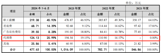 2022年,2023年,2024年1-6月,亚联机械销售费用中的代理费分别为110.90万元、194.54万元和124.13万元。无论是代理费的金额还是代理费占销售费用的比例均保持稳定上升趋势。