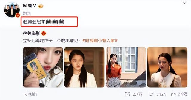 在 11 月 7 日,关晓彤发布微博为自己的新剧《小巷人家》进行宣传。没过多久,鹿晗便转发了这条微博,并热情地喊话大家追剧。这一举动本应是情侣之间甜蜜互动、相互支持的美好体现,也让网友们瞬间感受到了真情侣之间的甜蜜氛围,纷纷直呼 “真情侣就是甜”。然而,令人意想不到的是,鹿晗随后居然将这条宣传微博给删除了。这一操作瞬间让众人一脸茫然,满心疑惑。宣传微博都已经发出去了,为何又要删除呢?