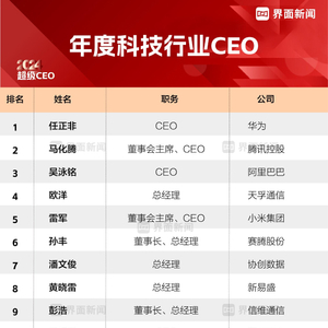 界面新闻2024年度科技行业CEO榜单发布:华为任正非再登榜首、小米雷军第五
