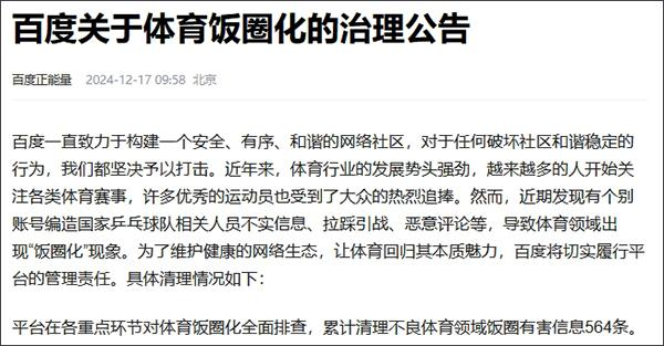 国家体育总局指出,巴黎奥运会后,公安部门发布一批打击涉体育领域“饭圈”违法犯罪典型案例,体育总局相关单位及时跟进,谴责违法犯罪行为,呼吁共同营造晴朗网络空间。同时,体育总局注重加强对运动员、教练员教育管理,运动员在接受新闻媒体采访时,明确表明坚决抵制畸形“饭圈文化”的鲜明态度,积极正向引导社会舆论。