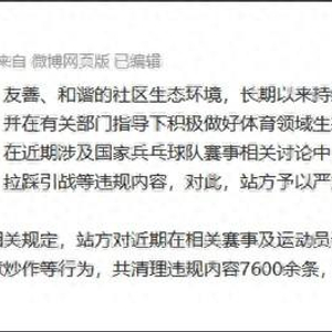 近日,在关于国家乒乓球队赛事相关讨论中,部分用户发布造谣抹黑、互撕谩骂、拉踩引战等违规内容。17日,微博、抖音、小红书、百度、腾讯、哔哩哔哩等网络平台同时发布公告,公开了对相关违规信息进行处理的情况。
