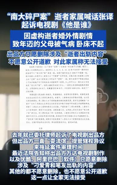 12月17日,一位网友自称“南大碎尸案”逝者刁爱青的姐夫,发文喊话演员张译,称其主演电视剧《他是谁》给被害人家属带来极大伤害。