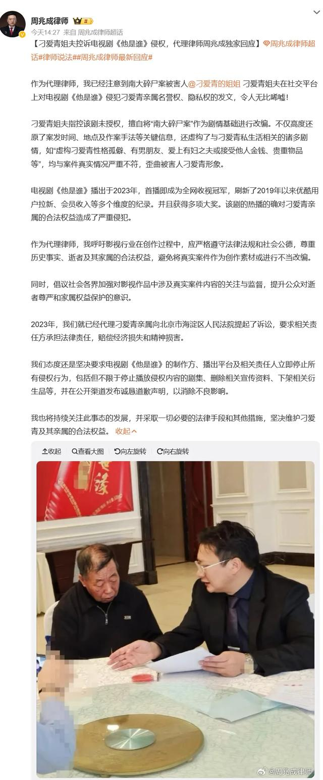 周兆成称该剧的热播的确对刁爱青亲属的合法权益造成了严重侵犯:“我呼吁影视行业在创作过程中,应严格遵守法律法规和社会公德,尊重历史事实、逝者及其家属的合法权益,避免将真实案件作为创作素材或进行不当改编。同时,倡议社会各界加强对影视作品中涉及真实案件内容的关注与监督,提升公众对逝者尊严和家属权益保护的意识。”