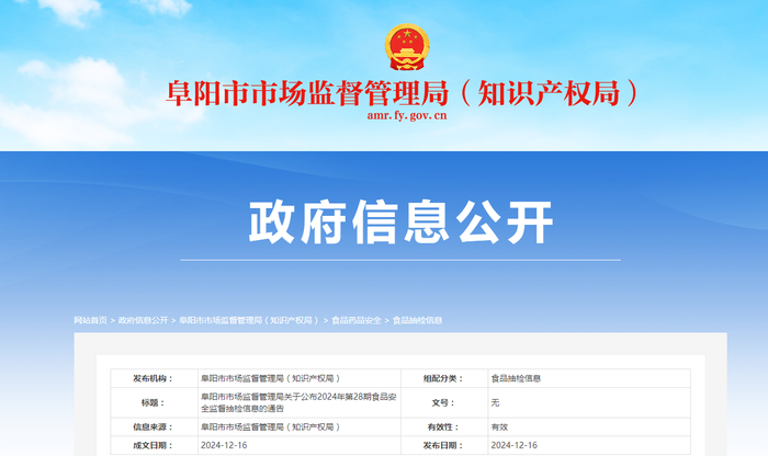 安徽省阜阳市市场监督管理局关于公布2024年第28期食品安全监督抽检信息的通告