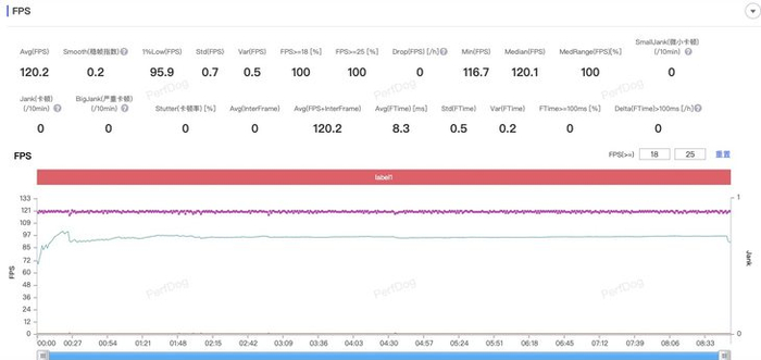 第 一轮测试项目是《王者荣耀》,我们开启极高帧率、超高分辨率、极 致画质,经过一局游戏测试后由Perfdog测得平均帧率为120.2FPS,游戏过程非常流畅,在多人团战满屏特效的情况下也没有出现卡顿掉帧的情况。