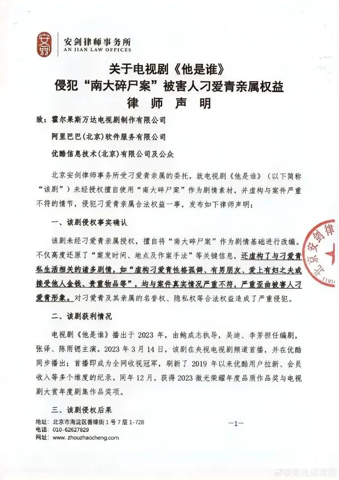 律师声明称,电视剧《他是谁》未经刁爱青亲属授权,擅自将“南大碎尸案”作为剧情基础进行改编不仅高度还原了“案发时间、地点及作案手法”等关键信息,还虚构了与刁爱青私生活相关的诸多剧情,如“虚构刁爱青性格孤僻、有男朋友、爱上有妇之夫或接受他人金钱、贵重物品等”,均与案件真实情况严重不符,严重歪曲被害人刁爱青形象。对刁爱青及其亲属的名誉权、隐私权等合法权益造成了严重侵犯。