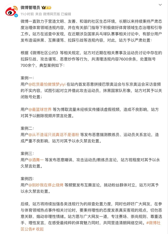 微博表示,站方对近期在相关赛事及运动员讨论中存在的拉踩引战、攻击谩骂、恶意炒作等行为,共清理违规内容7600余条,处置账号700余个。