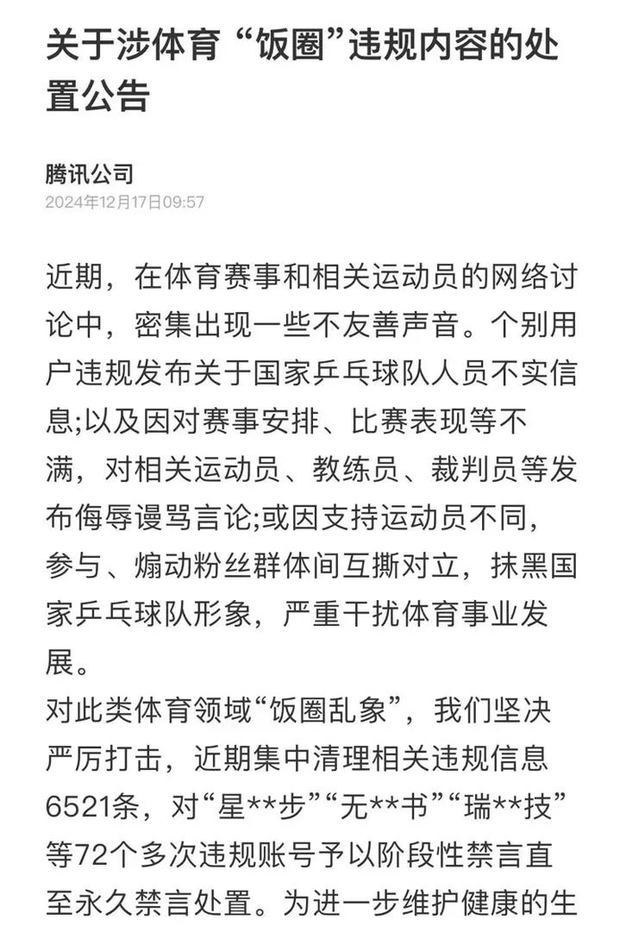 同日,腾讯公司发布公告称,近期对体育领域“饭圈乱象”严厉打击,集中清理相关违规信息6521条,对72个多次违规账号予以阶段性禁言直至永久禁言处置。