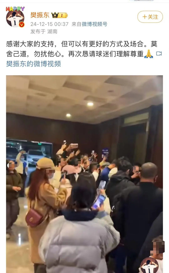 记者注意到,12月15日凌晨,国乒队员樊振东在其个人微博发布视频,视频中有大批粉丝围堵在电梯口,举着手机和相机在拍摄,樊振东配文称,“感谢大家的支持,但可以有更好的方式及场合。莫舍己道,勿扰他心。再次恳请球迷们理解尊重。”