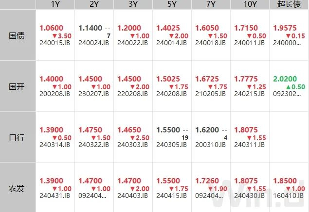 截至11:30,10年期国债活跃券240011收益率收益率下行0.55BP报1.7150%;10年期国开债活跃券240215收益率下行1.25BP至1.7775%,超长期国债活跃券2400006收益率下行0.15BP报1.9575%。