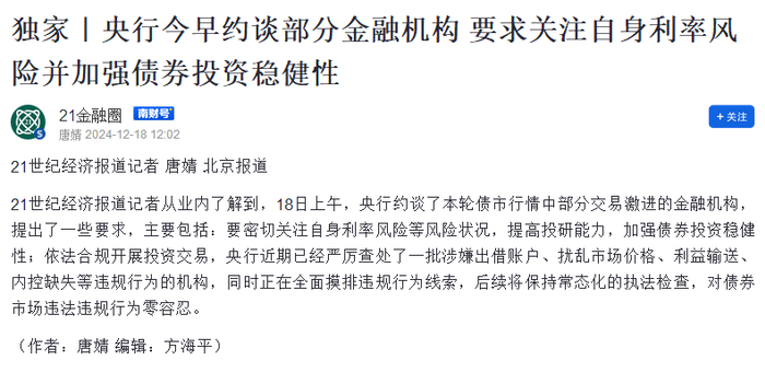 21世纪经济报道记者从业内了解到,18日上午,央行约谈了本轮债市行情中部分交易激进的金融机构(被约谈机构包括部分银行、券商、保险资管、理财子公司、基金、信托等等),提出了一些要求,主要包括:要密切关注自身利率风险等风险状况,提高投研能力,加强债券投资稳健性;依法合规开展投资交易,央行近期已经严厉查处了一批涉嫌出借账户、扰乱市场价格、利益输送、内控缺失等违规行为的机构,同时正在全面摸排违规行为线索,后续将保持常态化的执法检查,对债券市场违法违规行为零容忍。