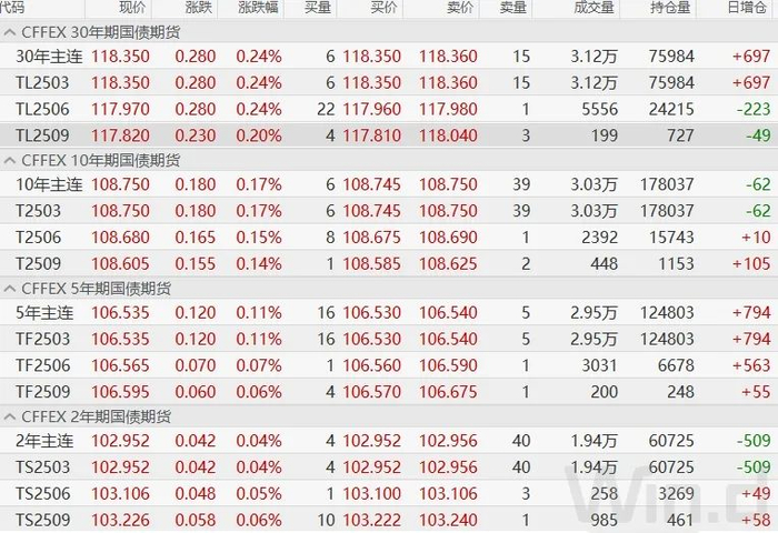 国债期货早盘收盘,30年期主力合约涨0.24%报118.350,10年期主力合约涨0.17%报108,750,5年期主力合约涨0.11%,2年期主力合约涨0.04%。