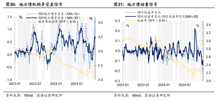 近两周机构行为表现 ①基金:配置动力很强,持仓久期明显拉长,但近期对10Y有止盈动作。②保险:在持续积极配置地方债的同时,出于回补久期的需要,本周也开始加仓超长国债。③银行:开始回补长债仓位。