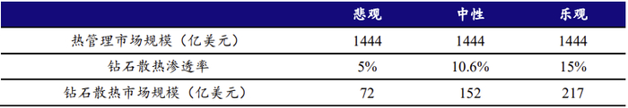 按照5%/10.6%/15%渗透率测算,钻石散热市场空间分别72/152/217亿美元