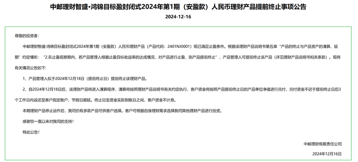 近日,中邮理财发布公告称,该公司发行的智盛·鸿锦目标盈封闭式2024年第1期(安盈款)人民币理财产品(产品代码:2401NJ0001)现已满足止盈条件。根据该理财产品说明书第五章“产品的终止与产品资产的清算、延期”约定情形:“2.在止盈观察期内,若产品管理人根据止盈目标收益率的达成情况,对产品进行止盈,则产品提前终止”,产品管理人可提前终止该产品(详见理财产品说明书相关条款)。