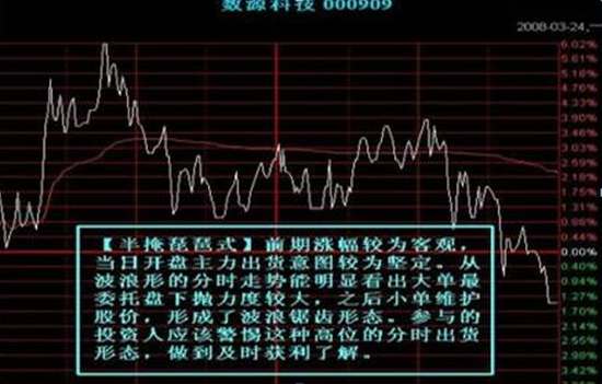 此种形态盘中较为常见,出现在主力短线高抛低吸走势中较多,短期有一定风险,如成交量和换手率没有成倍放大,对大势运行并无太大影响。只是在个股走出如此形态的时候介入需小心短期风险,持有需醒悟获利了结。