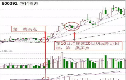 上图盛和资源(600392)在2016年4月13日前后出现第一类买点,三线金叉,且前期成交量长期萎缩,在金叉出现之际,底部成交量激增,股价放长红。随后该股开启一波拉升,4月22日开始出现几天回调,股价回踩10日均线获得支撑,第二类买点出现。