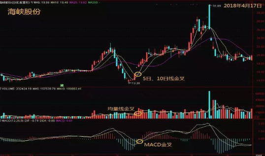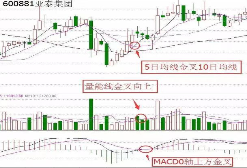 具体来说,就是5日均线和10日均线的金叉, 5日均量线和10日均量线的金叉,以及macd中的DIF线和DEF线的金叉。