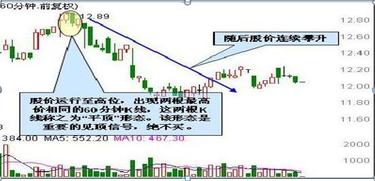 股价运行至高位,上攻受阻,抛压逐渐加重。随后连续两个60分钟K线有相同或极为相近的最高价,这两根K线称之为“平顶”形态。该K线形态形成后,意味着短期上攻受阻,行情摸高见顶,股价即将反转。不过平顶形态的反转力度较小,通常以阴跌为主。