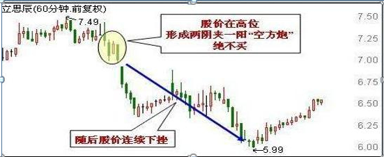 所谓的空方炮就是指两阴夹一阳的K线形态,它由两根较长的阴线和一根较短的阳线组成,三根K线呈下跌趋势,阳线夹在阴线之中,阴线的顶部尽量低,阳线的实体尽量短。当股价在高位区域出现空方炮时,表示空方取得支配地位,多方虽有反抗,但力量微弱,明显不敌空方,后市看跌。