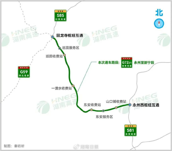 也就是说,永新高速的通车,与衡阳至永州高速组成湘南新的横向通道,构成与G60沪昆高速平行的东西向新通道。