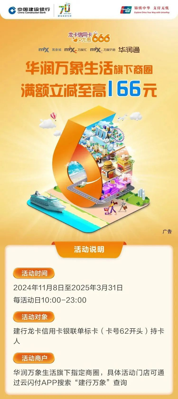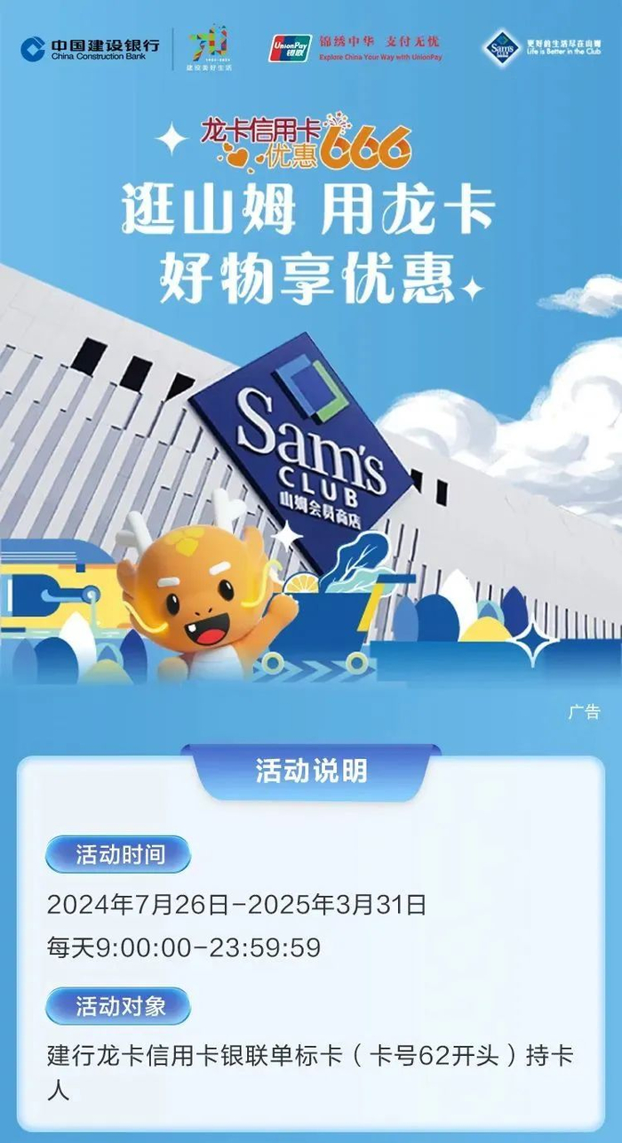 2024年7月26日至2025年3月31日,在山姆APP线上支付时选择中国银联(云闪付控件),并通过建行龙卡信用卡银联单标卡(卡号62开头)支付,单笔消费满166元立减16元,单用户单月限享1次优惠,活动期间限2次优惠。