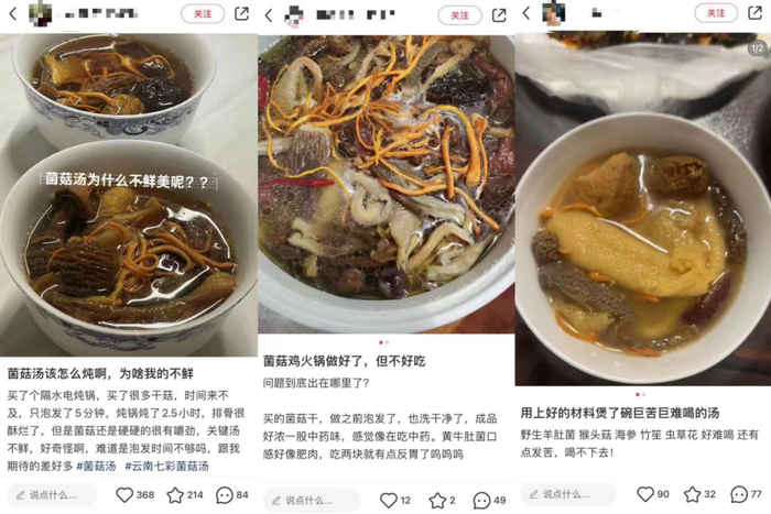 菌汤火锅鲜味清淡,可以刺激唾液分泌,令人食指大动,搭配各式青菜或面条,每一口都余味无穷。然而,现实是“用了上好的材料煲了碗巨苦巨难喝的汤”、“买了很多种干菇,只泡发了5分钟,炖锅炖了2.5小时,汤还是不鲜”……在社交平台上试图在家复刻菌汤火锅失败的帖比比皆是。