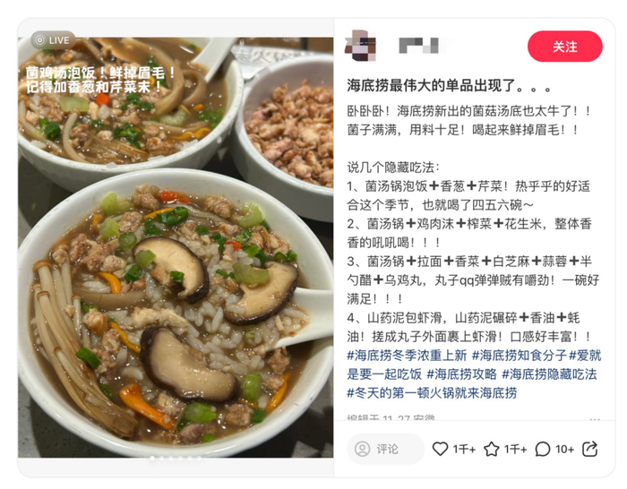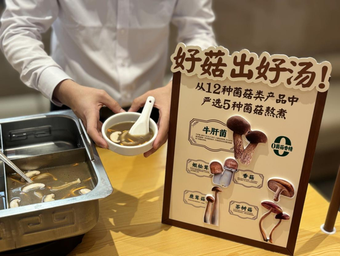 随着菌汤火锅持续升温,各家品牌开始卷品种、熬煮方式、甚至价格,海底捞则依托其强大的研发团队和供应链,选择了一条独特的道路——升级工艺。