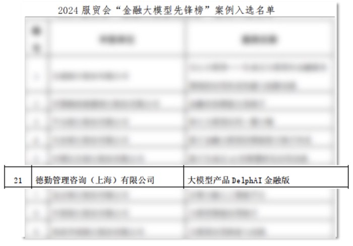 德勤与中意财险的合作研发成果因其技术领先性与对业务场景的突出价值贡献,也成功入选了2024 年中国国际服务贸易交易会(服贸会) “金融大模型先锋榜”。