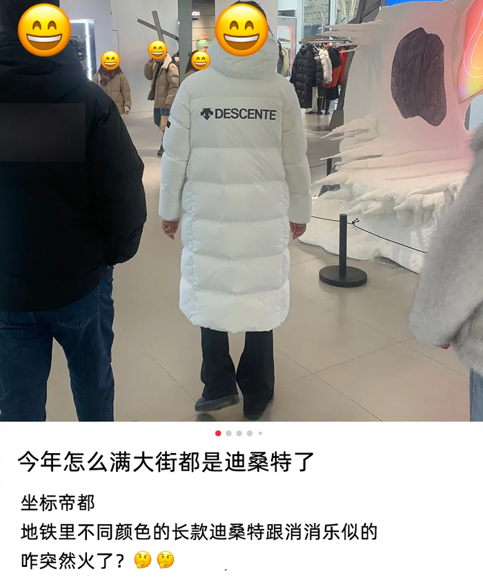 比如去年冬天,迪桑特黑色过膝羽绒服取代北面,成了大街上撞衫率最高的“街服”,被戏称是统一北京中产审美的“中年人工服”。
