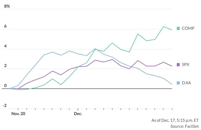 与此同时,特朗普胜选后跑赢的小盘股和其他价值领域(如金融股)却陷入了困境,自12月初以来,标普500指数中的金融股下跌了4.4%,包括公用事业和能源在内的许多其他行业股票的表现更差。