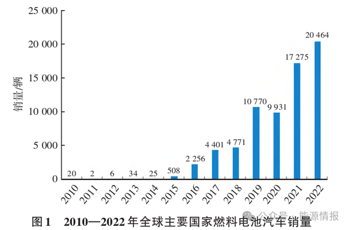 从全球来看,燃料电池汽车销量正处于高速增长阶段。截至2022年底,全球主要国家燃料电池汽车累计销量达7万辆,其中2022年全球销量突破2万辆(图1)。