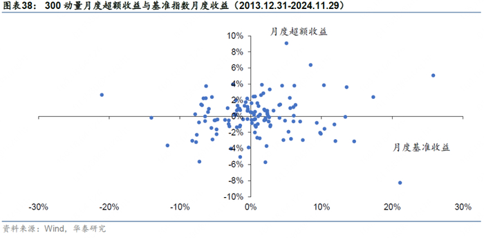 从净值表现来看,动量策略与前文所述的策略在趋势上大相径庭,相对走势呈现出整体震荡的特征,趋势周期较明显短于其他策略指数。从风险收益来看,动量策略长期收益略弱于基准,波动率和回撤有所提高,但最大涨幅也明显占优,呈现出高波动、高弹性、高回撤的特点。从胜率来看,区间内动量策略胜率低于50%,稳定性可能并不突出。