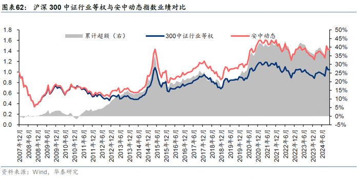 与前两点有所关联但略有不同之处还在于,国内资本市场相对年轻,市场有效性较低,波动性较大,长期配置力量相对较弱。当形成牛市预期时,投资者更倾向于配置高弹性品种,当形成市场下行的预期时,减仓解套是更为常见的做法。国内目前的Smart Beta产品缺少弹性品种,更缺乏能灵活加减仓位的产品,从而使得无论在上行市还是下行市里,相比数千只权益公募,并无突出的优势。这也是我们看到险资这类长期配置资金在2024年配置红利类Smart Beta产品,其中一个原因是其权益仓位并无太多可调降的空间。我们认为随着我国资本市场的不断发展,未来长期配置资金的加码入市,Smart Beta这类产品会受到这类型投资者的关注和青睐。