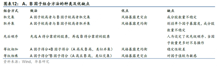 当因子的数量多于1个时,策略需要采取办法对各因子进行组合,常见的组合方式包括:等权相加、等权相乘、取交集、取并集、两指标按顺序使用等等。这些方法各有优劣,如对于等权相加和等权相乘两种方式,将指标A和指标B均标准化至0-1范围内,按等权相加的组合方式选择综合指标值靠前的股票,由下表可知,这些股票可能出现在指标A或B数值并不高的范围内;而按照等权相乘的组合方式选择综合指标值靠前的股票,可以看出,这些股票只会出现在指标A和B都较高的范围内。故可以简单地将等权相加的方式理解为选择“指标A高或B高”的股票,将等权相乘的方式理解为选择“指标A高且B高”的股票。