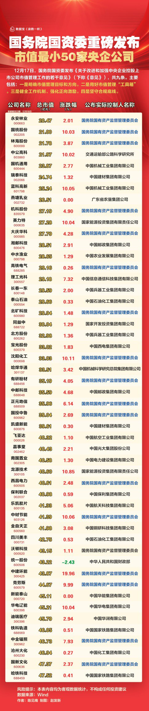 国务院国资委重磅发布 市值最小50家央企公司