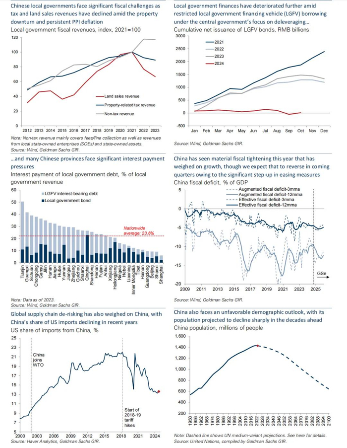 Hui Shan:政府于2021年开始了一轮针对多个行业的监管收紧,包括教育、游戏、医疗和金融等领域,这在一定程度上拖累了经济增长。同时,2021年开始的房地产市场低迷持续时间更长、影响更深,远超预期。此外,2024年又出现了一个重大冲击,中央推动地方政府加速去杠杆化。虽然从单一角度来看,这一举措是必要的,因为地方债务问题确实增加了金融压力,但在房地产低迷和市场信心低落的背景下,要求地方政府缩减债务负担的时机并不合适。这迫使地方政府采取极端措施,比如增加罚款、拖欠工资和供应商付款,这反而加剧了经济困境。这一冲击成为了推动9月份推出更有力、协调性更高的政策的“最后一根稻草”。