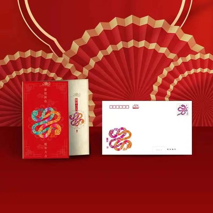 信封邮资整体采用火红的设计,营造出新年红红火火的氛围,整体以蛇的设计为主题,祥瑞气氛十足。