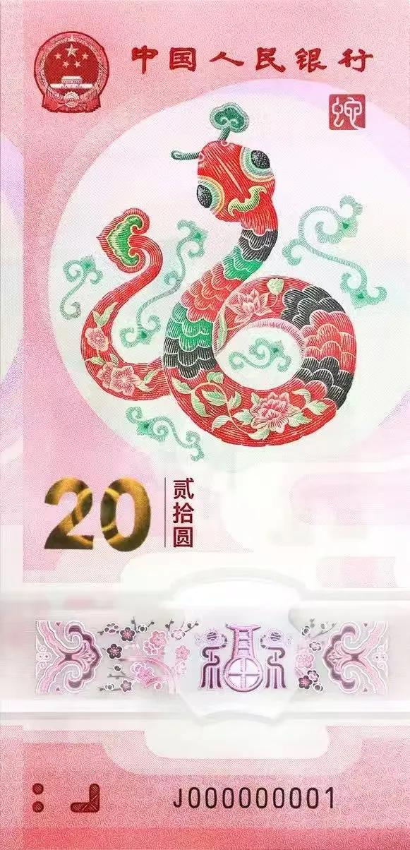 蛇年纪念钞面值20元,为国家法定货币,与人民币职能相同等值流通。