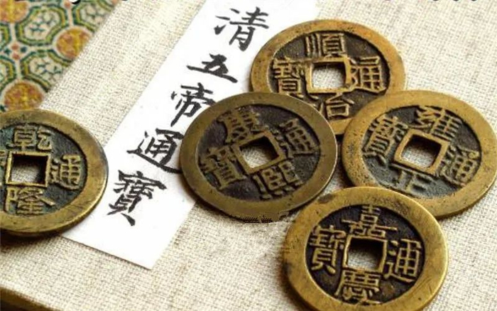 5枚清代五帝钱,分别是顺治、康熙、雍正、乾隆、嘉庆五个皇帝的铜钱。