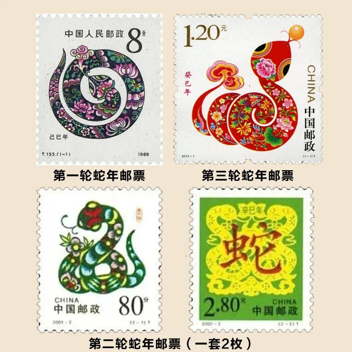 目前为止,中国邮政一共就发行过4次蛇年邮票(共6枚),在此次的《蛇舞紫禁》珍藏册中,套餐三 (大全套)将1-4轮蛇年邮票全部被收录其中!