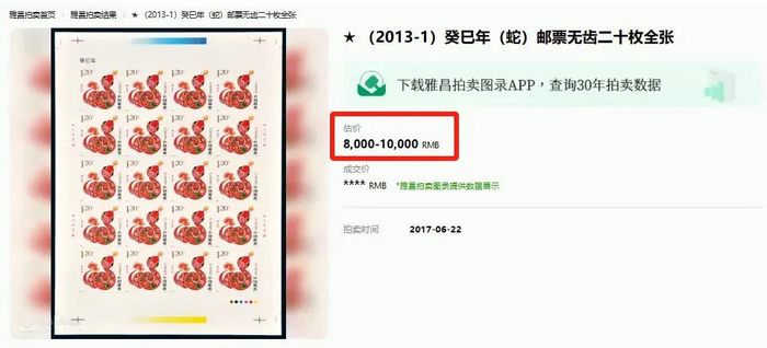 就拿这组癸巳年生肖邮票来说,拍卖价在近10000元,对比最初发行的价格,至少翻了400多倍!