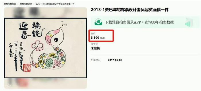 还有这张癸巳年蛇邮票的画稿,估价也接近3500元,可能它的设计者吴冠英也想不到。