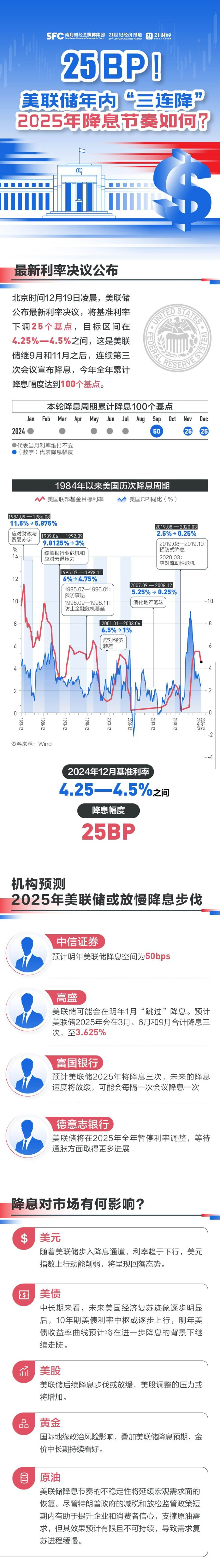北京时间周四(12月19日)凌晨,美联储宣布降息25个基点,将联邦基金利率目标区间从4.5%至4.75%调低至4.25%至4.5%。这也是美联储继9月和11月之后,连续第三次会议宣布降息,全年的累计降息幅度就此达到100个基点。