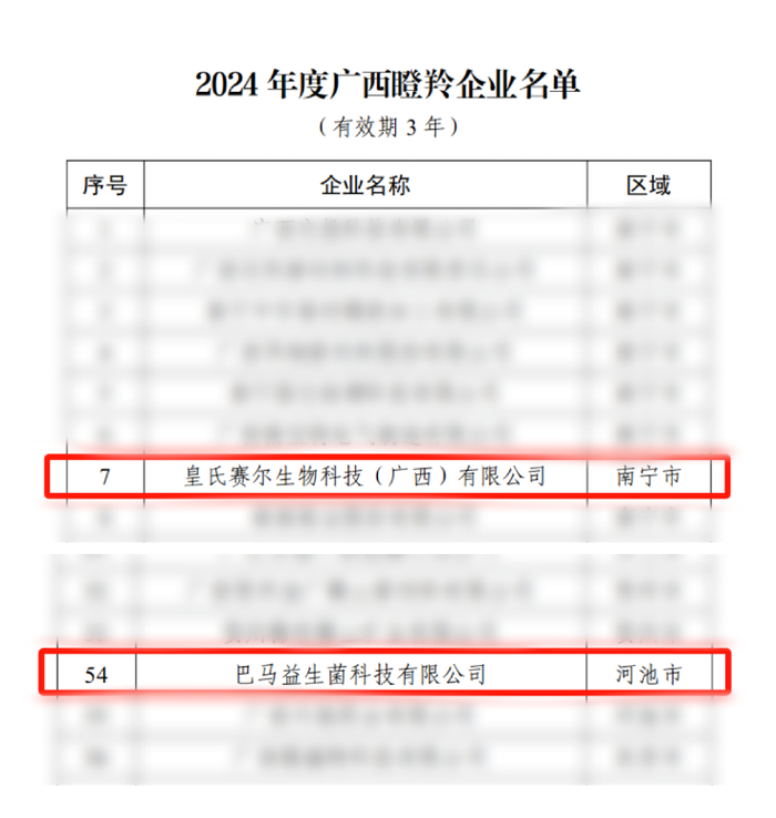 此外,皇氏集团旗下皇氏赛尔生物科技(广西)有限公司(以下简称“皇氏赛尔”)、巴马益生菌科技有限公司(以下简称“巴马益生菌”)凭借在专业创新、研发投入、成果转化及市场影响力等方面的突出表现,通过“2024年度广西瞪羚企业”认定、创新型中小企业认定、南宁市农业产业化龙头企业认定等,充分体现了上级部门对皇氏创新实力与发展前景的高度认可和期望。
