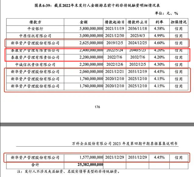 据万科2023年度第四期中期票据募集说明书显示,截至2022年末,排名前十的借款方包括新华资产和泰康资产,其中新华资产的借款金额合计97.82亿,泰康资产借款合计46亿。