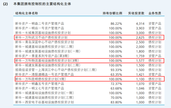 据新华保险2023年半年报显示,在其拥有控制权的主要结构化主体中,有3只产品与万科有相关,分别是新华-万科武汉不动产债权投资计划、新华-万科物流基础设施债权投资计划(3期)、新华-万科昆明债权投资计划(1期),持有份额均为100%,实收投资款分别为26.25亿元、15.77亿元、11亿元,合计53.02亿元。