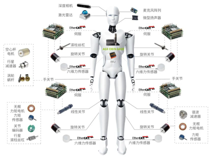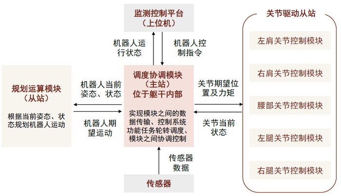 人形机器人的运动控制系统常见由上位机(监测控制平台)、传感器模块、主站、从站(全身运动规划、关节运动控制)构成。中央处理单元接收到传感器传输过来的大量数据后,CPU将由GPU生成的高层级行为决策转换成低层级的系统命令,将包含位置、姿态、转速等信息的控制信号经由主站传递给位于从站的执行机构,驱动器负责解析控制指令并将指令转化为电流信号驱动相应电机,电机通过减速器等传动装置将动力传递到机械本体,从而完成对机器人系统的精准控制。